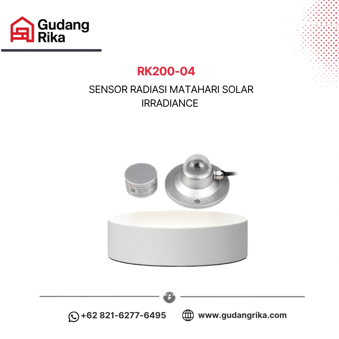 Sensor Radiasi Matahari Solar Irradiance Rika RK200-04 merupakan perangkat sensor yang dirancang untuk mengukur intensitas radiasi matahari yang diterima pada suatu permukaan. Sensor ini digunakan untuk memantau nilai solar irradiance secara akurat sehingga dapat memberikan data penting terkait potensi energi matahari serta kondisi radiasi lingkungan. Dengan kemampuan pengukuran yang stabil, sensor ini sangat cocok digunakan pada berbagai sistem monitoring energi surya maupun pengamatan meteorologi.